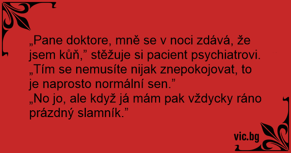 „Pane doktore, mně se v noci zdává, že jsem kůň,” stěžuje si pacient psychiatrovi.