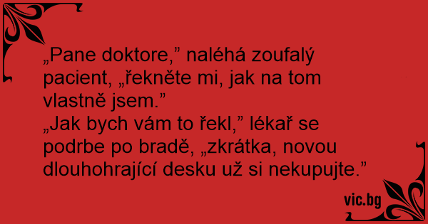 „Pane doktore,” naléhá zoufalý pacient, „řekněte mi, jak na tom vlastně jsem.”