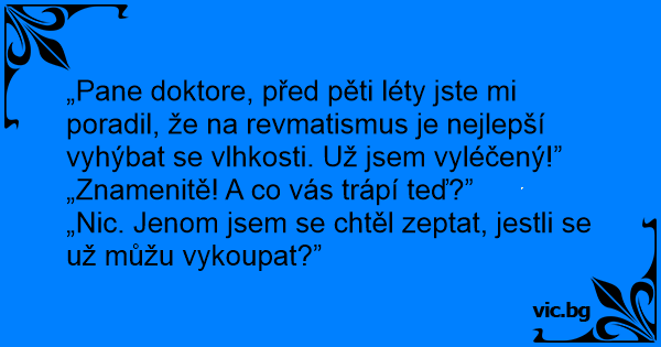 „Pane doktore, před pěti léty jste mi poradil, že na revmatismus je nejlepší vyhýbat se vlhkosti. Už jsem vyléčený!”