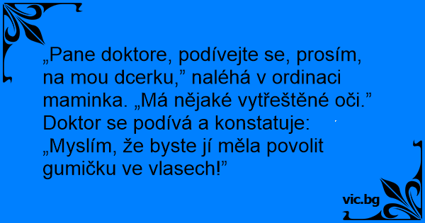 Doktor se podívá a konstatuje: „Myslím, že byste jí měla povolit gumičku ve vlasech!”
