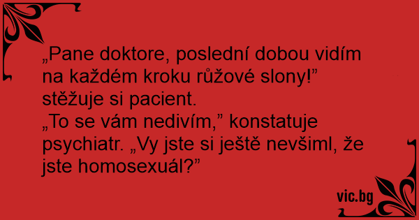 „Pane doktore, poslední dobou vidím na každém kroku růžové slony!” stěžuje si pacient.