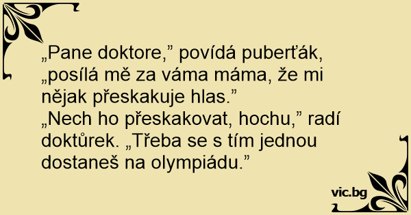 „Pane doktore,” povídá puberťák, „posílá mě za váma máma, že mi nějak přeskakuje hlas.”