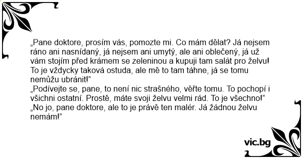 „Pane doktore, prosím vás, pomozte mi. Co mám dělat? Já nejsem ráno ani nasnídaný, já nejsem ani umytý, ale ani oblečený, já už vám stojím před krámem se zeleninou a kupuji tam salát pro želvu! To je vždycky taková ostuda, ale mě to tam táhne, já se tomu nemůžu ubránit!”