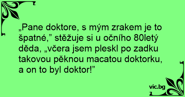 „Pane doktore, s mým zrakem je to špatné,” stěžuje si u očního 80letý děda, „včera jsem pleskl po zadku takovou pěknou macatou doktorku, a on to byl doktor!”