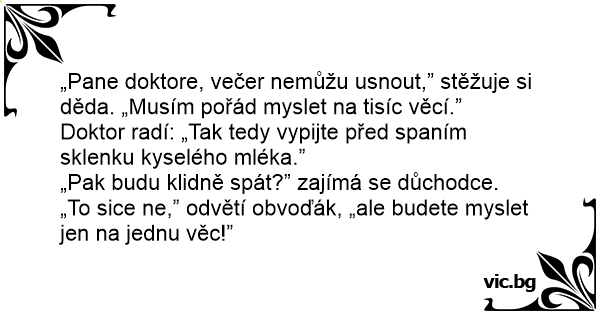 „Pane doktore, večer nemůžu usnout,” stěžuje si děda. „Musím pořád myslet na tisíc věcí.”