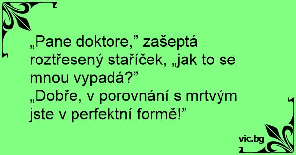 „Pane doktore,” zašeptá roztřesený staříček, „jak to se mnou vypadá?”
