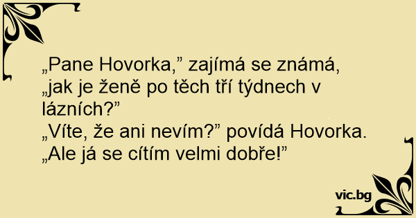 „Pane Hovorka,” zajímá se známá, „jak je ženě po těch tří týdnech v lázních?” „Víte, že ani nevím?” povídá Hovorka. „Ale já se cítím velmi dobře!”