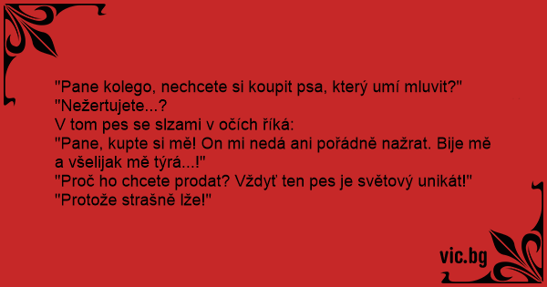 "Pane kolego, nechcete si koupit psa, který umí mluvit?"