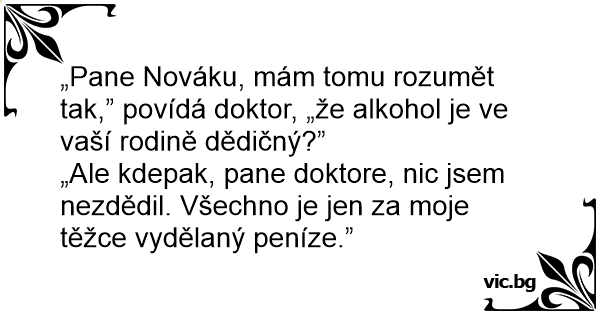 „Pane Nováku, mám tomu rozumět tak,” povídá doktor, „že alkohol je ve vaší rodině dědičný?”