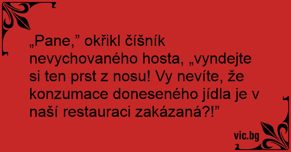 „Pane,” okřikl číšník nevychovaného hosta, „vyndejte si ten prst z nosu! Vy nevíte, že konzumace doneseného jídla je v naší restauraci zakázaná?!”