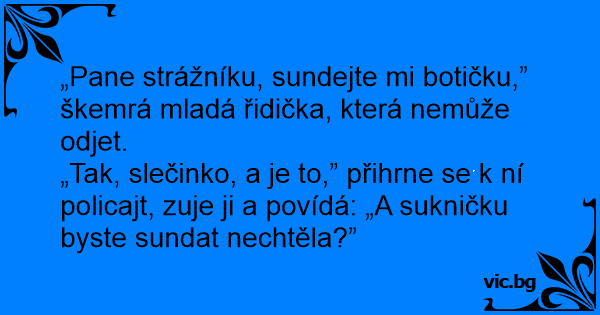 „Tak, slečinko, a je to,” přihrne se k ní policajt, zuje ji a povídá: „A sukničku byste sundat nechtěla?”
