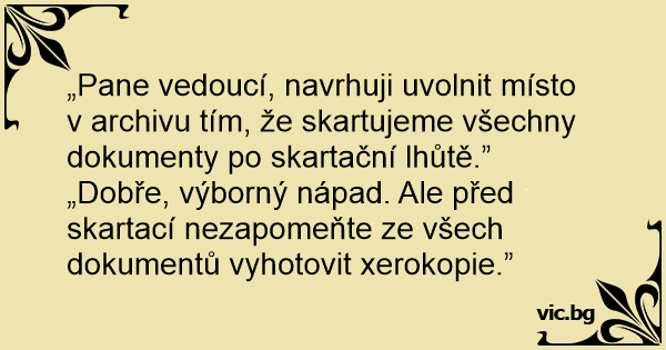 „Dobře, výborný nápad. Ale před skartací nezapomeňte ze všech dokumentů vyhotovit xerokopie.”