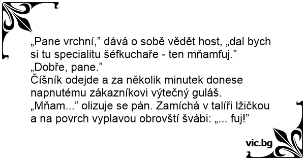 „Pane vrchní,” dává o sobě vědět host, „dal bych si tu specialitu šéfkuchaře - ten mňamfuj.”