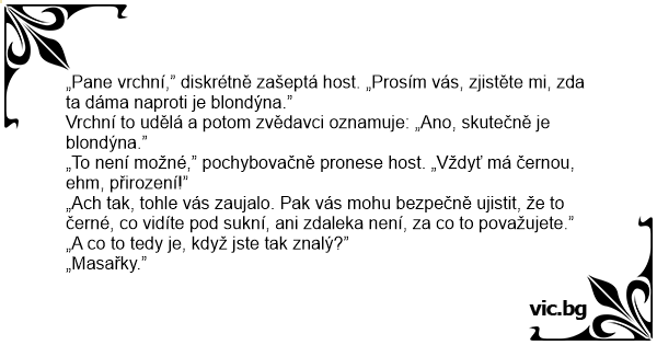 „Pane vrchní,” diskrétně zašeptá host. „Prosím vás, zjistěte mi, zda ta dáma naproti je blondýna.”
