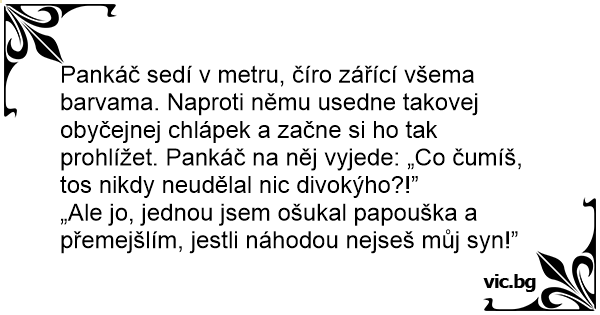 Pankáč sedí v metru, číro zářící všema barvama. Naproti němu usedne takovej obyčejnej chlápek a začne si hо tak prohlížet. Pankáč na něj vyjede: „Co čumíš, tos nikdy neudělal nic divokýho?!”
