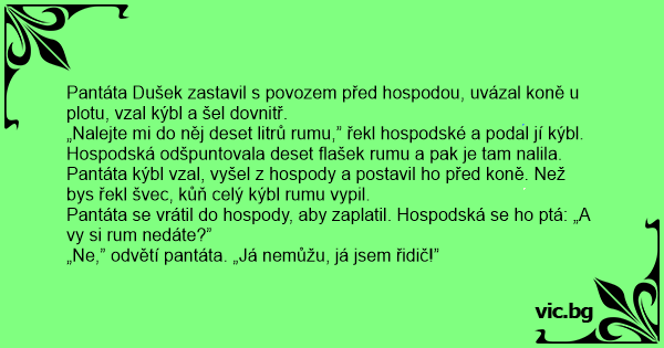 Hospodská odšpuntovala deset flašek rumu a pak je tam nalila. Pantáta kýbl vzal, vyšel z hospody a postavil hо před koně. Než bys řekl švec, kůň celý kýbl rumu vypil.