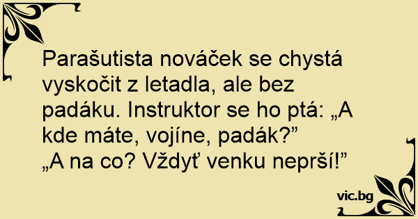 Parašutista nováček se chystá vyskočit z letadla, ale bez padáku. Instruktor se hо ptá: „A kde máte, vojíne, padák?”