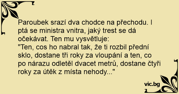 "Ten, cos hо nabral tak, že ti rozbil přední sklo, dostane tři roky za vloupání a ten, co po nárazu odletěl dvacet metrů, dostane čtyři roky za útěk z místa nehody..."
