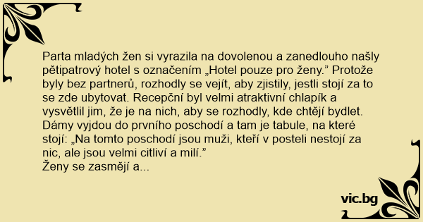 Parta mladých žen si vyrazila na dovolenou a zanedlouho našly pětipatrový hotel s označením „Hotel pouze pro ženy.” Protože byly bez partnerů, rozhodly se vejít, aby zjistily, jestli stojí za to se zde ubytovat. Recepční byl velmi atraktivní chlapík a vysvětlil jim, že je na nich, aby se rozhodly, kde chtějí bydlet.
