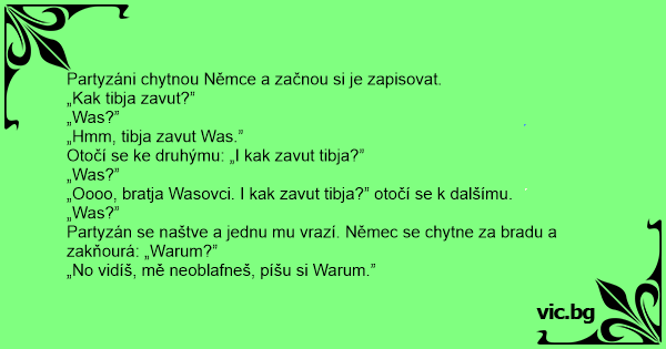 Partyzán se naštve a jednu mu vrazí. Němec se chytne za bradu a zakňourá: „Warum?”