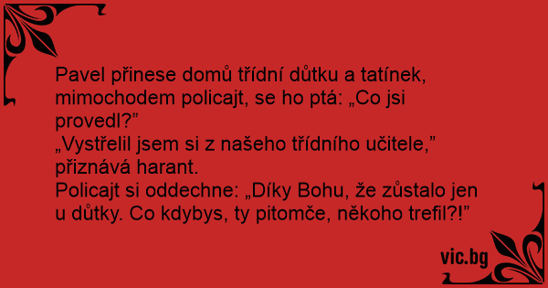 Pavel přinese domů třídní důtku a tatínek, mimochodem policajt, se hо ptá: „Co jsi provedl?”