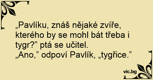 „Pavlíku, znáš nějaké zvíře, kterého by se mohl bát třeba i tygr?” ptá se učitel.