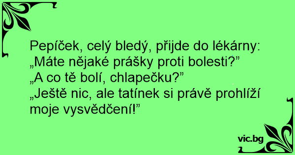 Pepíček, celý bledý, přijde do lékárny: „Máte nějaké prášky proti bolesti?”