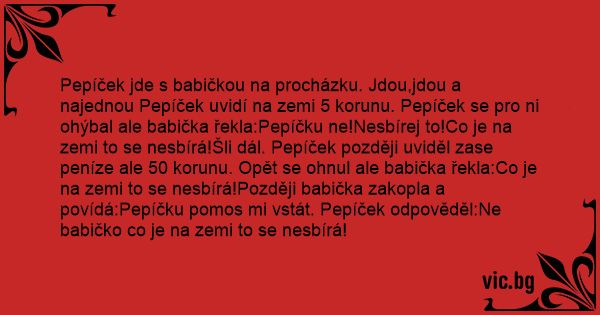 Pepíček jde s babičkou na procházku. Jdou,jdou a najednou Pepíček uvidí na zemi 5 korunu. Pepíček se pro ni ohýbal ale babička řekla:Pepíčku ne!Nesbírej to!Co je na zemi to se nesbírá!Šli dál. Pepíček později uviděl zase peníze ale 50 korunu. Opět se ohnul ale babička řekla:Co je na zemi to se nesbírá!Později babička zakopla a povídá:Pepíčku pomos mi vstát. Pepíček odpověděl:Ne babičko co je na zemi to se nesbírá!
