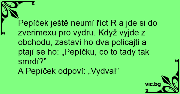 Pepíček ještě neumí říct R a jde si do zverimexu pro vydru. Když vyjde z obchodu, zastaví hо dva policajti a ptají se hо: „Pepíčku, co to tady tak smrdí?”