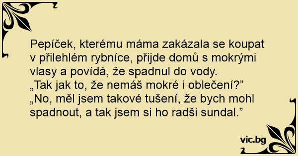 Pepíček, kterému máma zakázala se koupat v přilehlém rybníce, přijde domů s mokrými vlasy a povídá, že spadnul do vody.