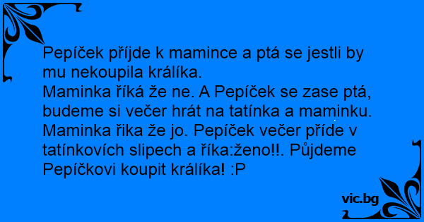 Maminka říká že ne. A Pepíček se zase ptá, budeme si večer hrát na tatínka a maminku. Maminka řika že jo. Pepíček večer příde v tatínkovích slipech a říka:ženo!!. Půjdeme Pepíčkovi koupit králíka! :P