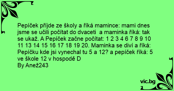 Pepíček příjde ze školy a říká mamince: mami dnes jsme se učili počítat do dvaceti a maminka říká: tak se ukaž. A Pepíček začne počítat: 1 2 3 4 6 7 8 9 10 11 13 14 15 16 17 18 19 20. Maminka se diví a říká: Pepíčku kde jsi vynechal tu 5 a 12? a pepíček říká: 5 ve škole 12 v hospodě D