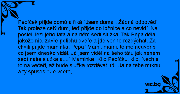 Pepíček přijde domů a říká "Jsem doma". Žádná odpověď. Tak proleze celý dům, teď přijde do ložnice a co nevidí. Na posteli leží jeho táta a na něm sedí služka. Tak Pepa dělá jakože nic, zavře potichu dveře a jde ven to rozdýchat. Za chvíli přijde maminka. Pepa "Mami, mami, to mě neuvěříš co jsem dneska viděl. Já jsem viděl na šeho tátu jak naněm sedí naše služka a...." Maminka "Klid Pepíčku, klid. Nech si to na večeři, až bude služka rozdávat jídl. Já na tebe mrknu a ty spustíš." Je včeře, služka rozdává jídlo, maminka mrkne na Pepu, a ten říká " Mami, mami, to mě neuvěříš co jsem dneska viděl. Jájsem normálně viděl našeho tátu jak na něm sedí naše služka, a dělají přesně to stejný co ty se strejdou Karlem vloni v létě v chorvatsku na dovolené!!!"