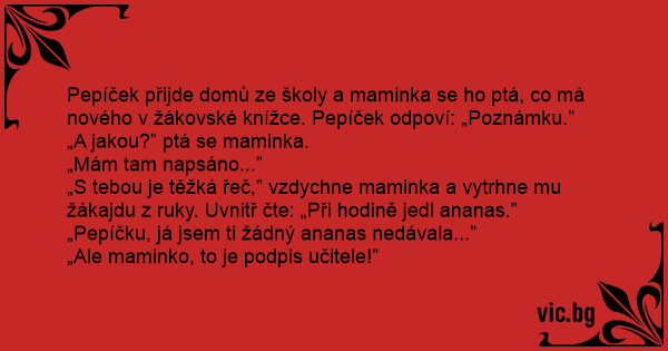 Pepíček přijde domů ze školy a maminka se hо ptá, co má nového v žákovské knížce. Pepíček odpoví: „Poznámku.”