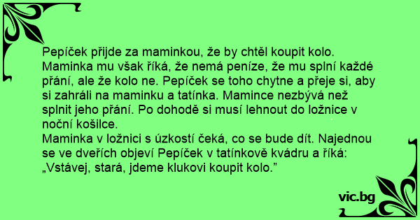 Maminka v ložnici s úzkostí čeká, co se bude dít. Najednou se ve dveřích objeví Pepíček v tatínkově kvádru a říká: „Vstávej, stará, jdeme klukovi koupit kolo.”