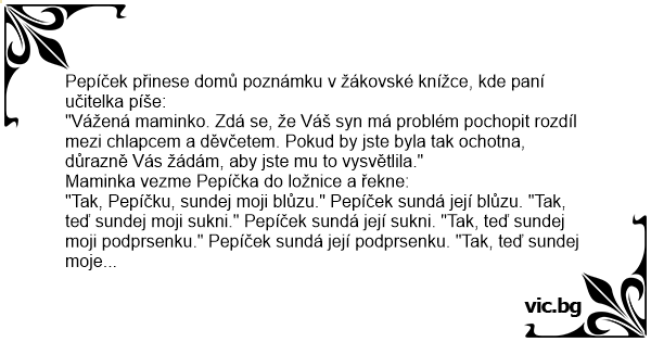 "Tak, Pepíčku, sundej moji blůzu." Pepíček sundá její blůzu. "Tak, teď sundej moji sukni." Pepíček sundá její sukni. "Tak, teď sundej moji podprsenku." Pepíček sundá její podprsenku. "Tak, teď sundej moje kalhotky." Pepíček sundá její kalhotky. "Tak, a teď Tě důrazně žádám, aby jsi už nikdy nechodil do školy v mém oblečení!!"