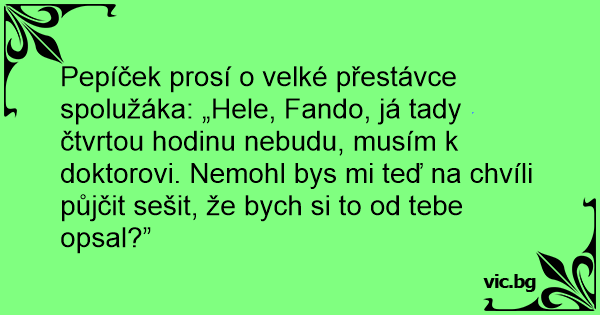 Pepíček prosí o velké přestávce spolužáka: „Hele, Fando, já tady čtvrtou hodinu nebudu, musím k doktorovi. Nemohl bys mi teď na chvíli půjčit sešit, že bych si to od tebe opsal?”