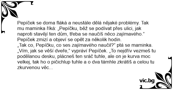 „Vím, jak se věší dveře,” vypráví Pepíček. „To nejdřív vezmeš tu podělanou desku, plácneš ten sráč tuhle, ale on je kurva moc velkej, tak hо o pičichlup tuhle a o dva támhle zkrátíš a celou tu zkurvenou věc secvakneš dohromady.”