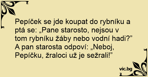 Pepíček se jde koupat do rybníku a ptá se: „Pane starosto, nejsou v tom rybníku žáby nebo vodní hadi?”
