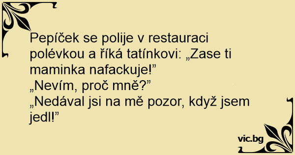 Pepíček se polije v restauraci polévkou a říká tatínkovi: „Zase ti maminka nafackuje!”
