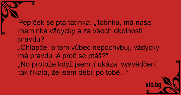 Pepíček se ptá tatínka: „Tatínku, má naše maminka vždycky a za všech okolností pravdu?”
