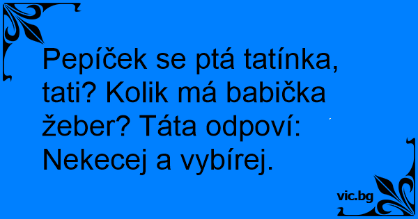 Pepíček se ptá tatínka, tati? Kolik má babička žeber? Táta odpoví: Nekecej a vybírej.