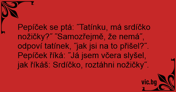 Pepíček se ptá: ˝Tatínku, má srdíčko nožičky?˝ ˝Samozřejmě, že nemá˝, odpoví tatínek, ˝jak jsi na to přišel?˝. Pepíček říká: ˝Já jsem včera slyšel, jak říkáš: Srdíčko, roztáhni nožičky˝.