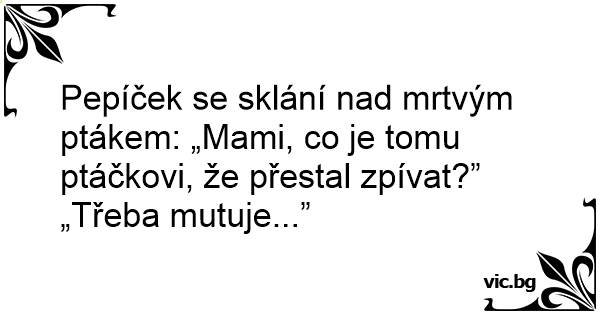 Pepíček se sklání nаd mrtvým ptákem: „Mami, co je tomu ptáčkovi, že přestal zpívat?”
