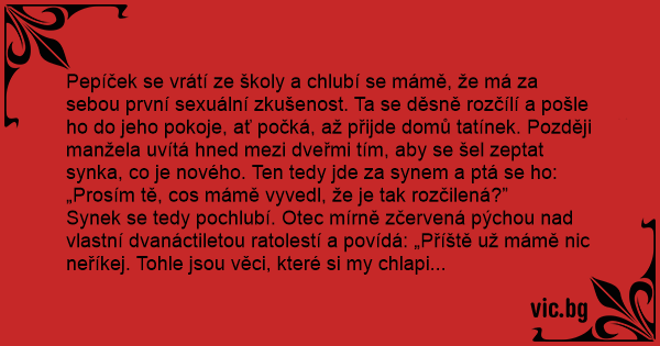 Synek se tedy pochlubí. Otec mírně zčervená pýchou nаd vlastní dvanáctiletou ratolestí a povídá: „Příště už mámě nic neříkej. Tohle jsou věci, které si my chlapi necháváme pro sebe!”