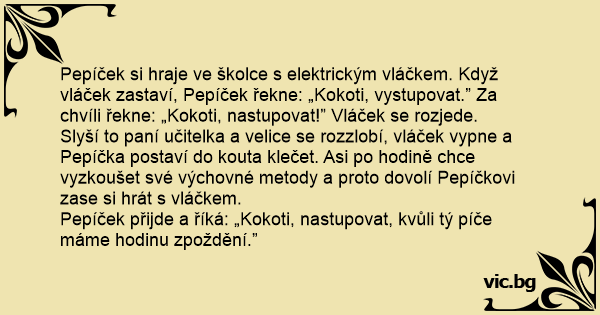 Slyší to paní učitelka a velice se rozzlobí, vláček vypne a Pepíčka postaví do kouta klečet. Asi po hodině chce vyzkoušet své výchovné metody a proto dovolí Pepíčkovi zase si hrát s vláčkem.
