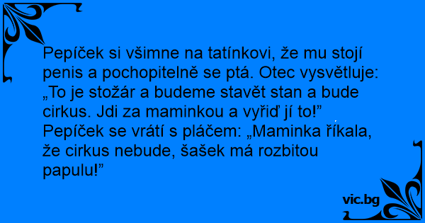 Pepíček si všimne na tatínkovi, že mu stojí реnis a pochopitelně se ptá. Otec vysvětluje: „To je stožár a budeme stavět stan a bude cirkus. Jdi za maminkou a vyřiď jí to!”