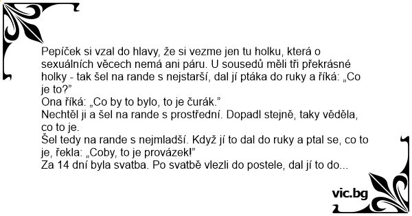 Pepíček si vzal do hlavy, že si vezme jen tu holku, která o sexuálních věcech nemá ani páru. U sousedů měli tři překrásné holky - tak šel na rande s nejstarší, dal jí ptáka do ruky a říká: „Co je to?”