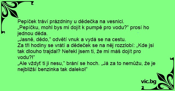 Za tři hodiny se vrátí a dědeček se na něj rozzlobí: „Kde jsi tak dlouho trajdal? Neřekl jsem ti, že mi máš dojít pro vodu?!”