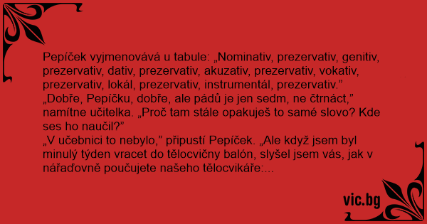 Pepíček vyjmenovává u tabule: „Nominativ, prezervativ, genitiv, prezervativ, dativ, prezervativ, akuzativ, prezervativ, vokativ, prezervativ, lokál, prezervativ, instrumentál, prezervativ.”
